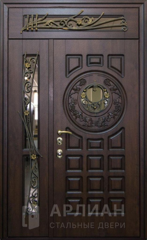Полуторная входная дверь с элементами ковки и стеклом №72